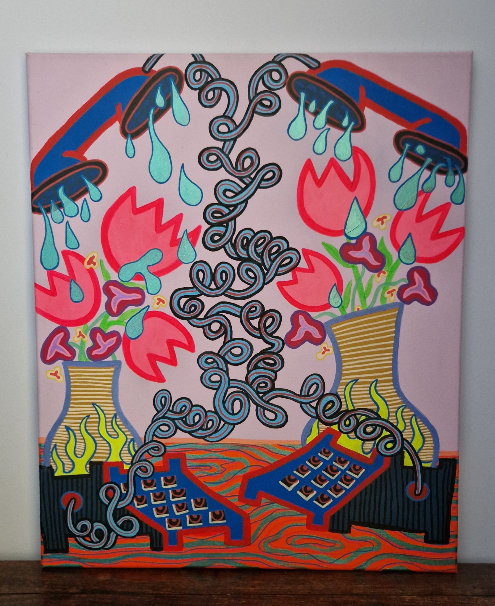 A bold and vibrant acrylic on canvas featuring surreal imagery of telephones, flowing patterns, and blooming flowers. Taylor Bystom combines striking colours and fluid linework to create a dynamic composition that blends technology, nature, and imagination. A piece that adds energy and modern flair to any collection or space.