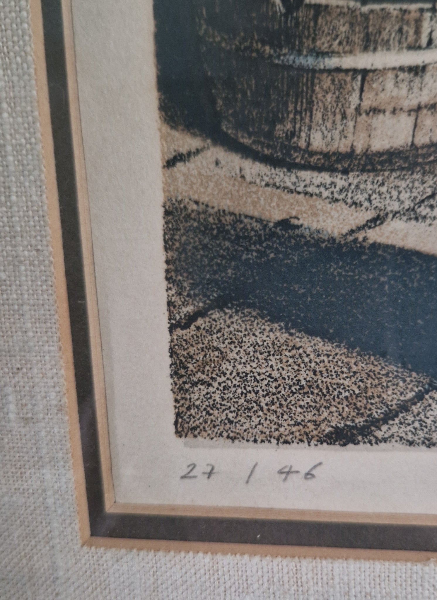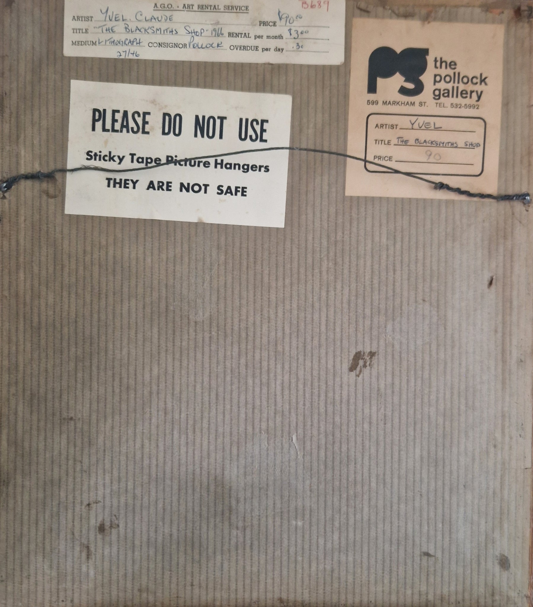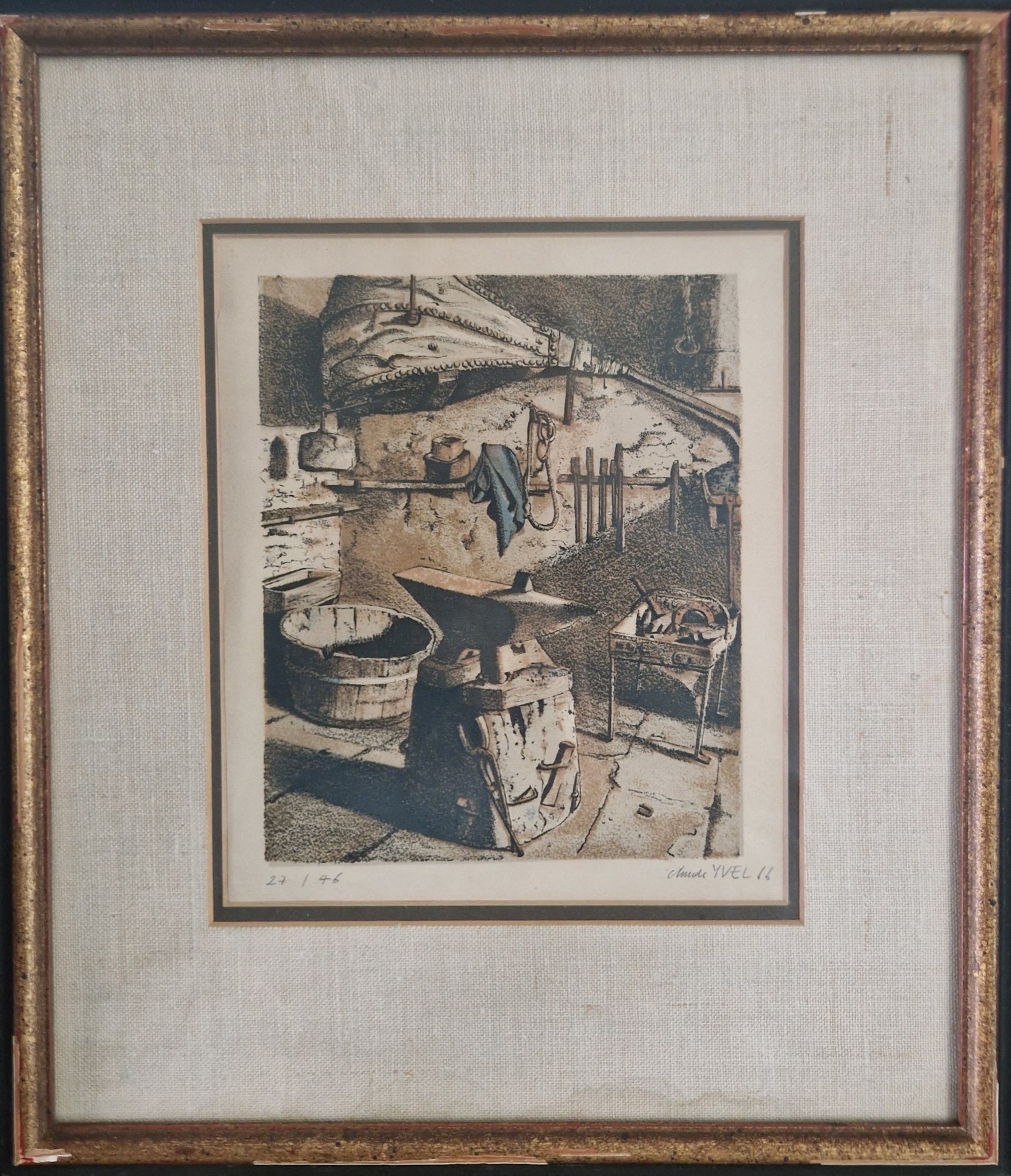 A signed, framed, limited edition lithograph by the French artist Claude Yvel, 'The Blacksmith's Shop'.
